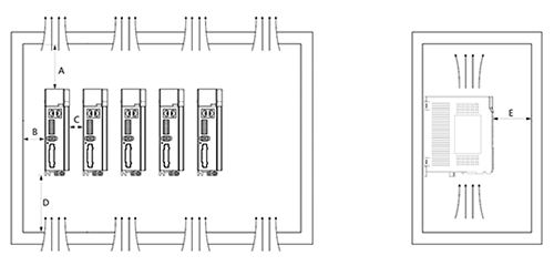 并排安裝時(shí),橫向兩側(cè)建議各留 30mm 以上間距V1規(guī)格,無風(fēng)扇結(jié)構(gòu),采用側(cè)面散熱片進(jìn)行散熱,因此必須留有30mm的間隙)。首尾兩臺(tái)驅(qū)動(dòng)器與柜體側(cè)面之間,至少留有 50mm 間隙。